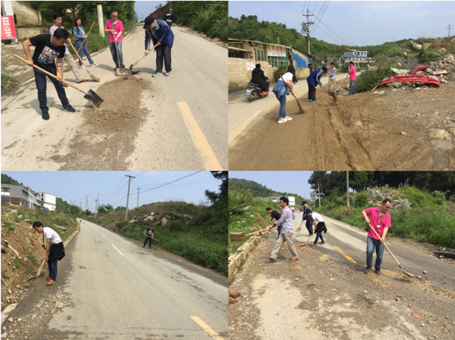 5月1日上班看到因前晚下暴雨进公司的道路路面上有多处被大雨冲出的泥和碎石,影响车辆行驶安全。永兴支部及时组织公司党员和积极分子开展主题党日活动进行道路清理。党员和积极分子积极响应,拿着铁铲和扫帚沿途清理路面的碎石和泥沙,为出行郊游、办事的车辆清理出顺畅的路面。
