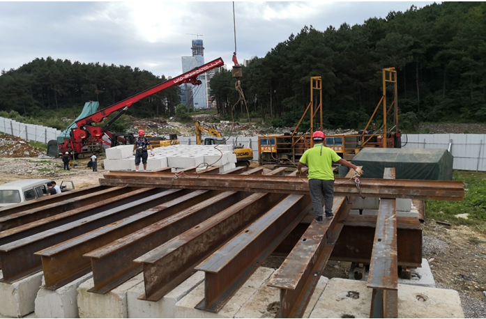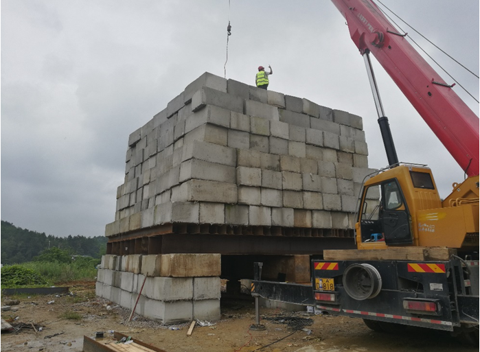 钢梁和压重块吊装前,项目组成员李剑育和田连波对堆载平台钢梁的摆放顺序和压重块的堆载顺序进行了准确的定位,保证堆载和试验过程中压重平台的整体稳定性。压重块吊装前,李剑育对项目组7名具有丰富吊装经验的技术人员进行了安全技术交底,确保吊装过程中的人身安全(详本项目堆载现场工作安全交底)。吊装过程中,严格按照现场指挥技术人员的要求进行现场操作,确保现场指挥技术人员和吊车师傅能进行手势语言的正常沟通,避免在搭建平台高处吊车师傅的视野盲区出现意外风险(详见图2、图3)。
