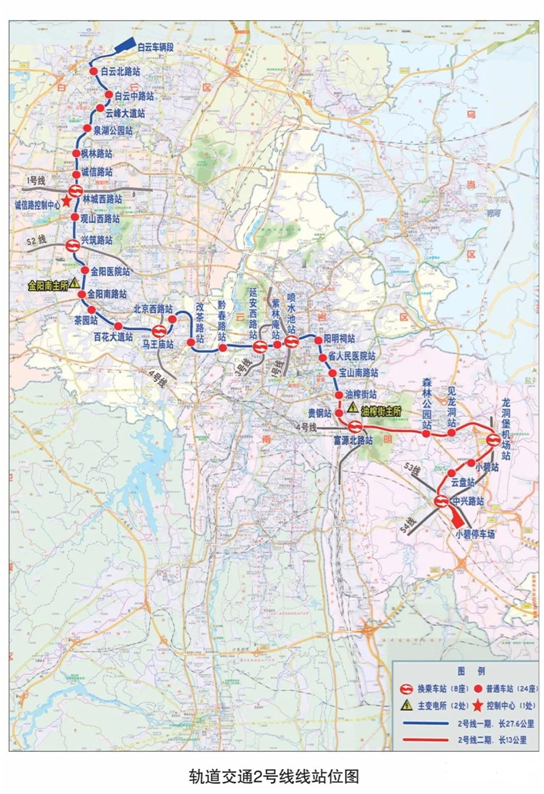 贵阳轨道交通2号线一期和二期连接白云区、观山湖区云岩区、南明区和双龙航空港经济区,全长40.6公里,设车站32座,其中地下站30座,高架站2座。其中一期工程从白云北路站至油榨街站,线路全长27.6公里,共24个车站;二期工程从油榨街站至中兴路站,线路全长13公里,共8个车站。车辆采用B型车六节编组(四动两拖),宽2.8米,长119.88米,额定载客量为1460人,满载为2062人,整车国产化率达90%,最高运行速度为80km/h。